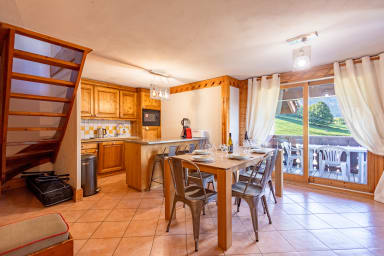 L’espace de vie comprend un grand salon chaleureux, une cuisine toute équipée, une grande table à manger et un balcon ensoleillé donnant sur les pistes.